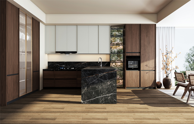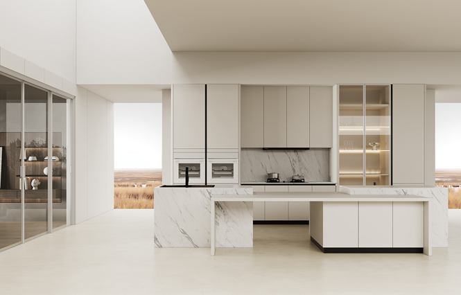 通过j9国际厨柜量体裁柜,定制出适合主厨下厨的烹饪区和洗涤区的舒适高度。